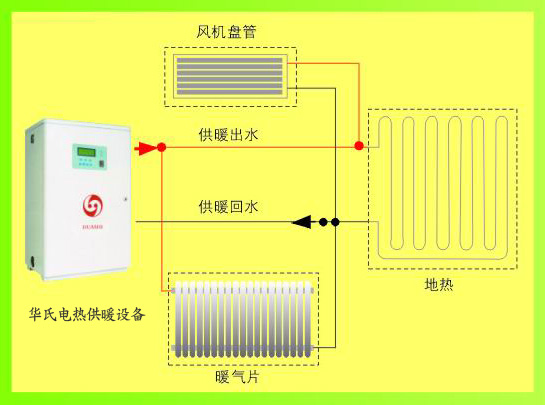华氏电热供暖设备是集电机、水泵、锅炉于一体的环保节能型现代化供暖设备,与暖气片、地暖联接成水循环供暖系统,热转换率高达100%。适用于家庭、单位,分户、集中供暖。