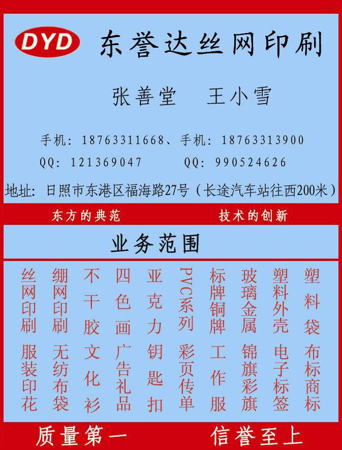 本公司技术雄厚在青岛工作多年经验丰富 质量第一 信誉之上 价格最低专业丝网印刷 四色套印 太阳能贴画 不干胶 PVC标签 面板系列 车友贴 亚克力系列 玻璃金属制品 塑料制品 电子外壳印字 塑料包装 标牌类:各种铜、铝、不锈钢、奖牌、办公牌。服装印花;锦旗彩旗 无纺布袋 鼠标垫 帐篷伞 文化衫 广告礼品 丝网制版 电话 18763311668欢迎 随时来电咨询地址日照市东港区福海路27号汽车站往西200米