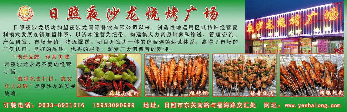 夜沙龙国际餐饮有限公司始创于1998年,在济南正式营业。历经12个春秋的稳步发展,公司于2009年正式成立,在经过短短一年的发展后,现已在济南、滨州、潍坊、临沂、日照、威海、淄博、菏泽等城市有了18家加盟店。为实现全国烧烤第一连锁的战略目标,夜沙龙创造性地运用区域特许经营复制模式发展连锁加盟体系,整合社会资源,以资本运营为纽带,构建集人力资源培养和输送、管理咨询、产品研发、市场营销、物流配送、项目开发为一体的综合连锁运营体系。未来五年,夜沙龙将实现全国百城千家加盟店的战略布局,做成名副其实的全国餐饮连锁第一品牌。“创造品牌,经营美味”是夜沙龙永远不变的经营宗旨;“靠特色去打拼,靠文化去发展”,是夜沙龙的发展战略。相信我们夜沙龙是最卓越、最优秀的! |