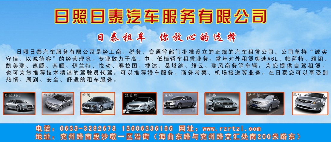 日照日泰汽车服务有限公司是经工商、税务、交通等部门批准设立的正规的汽车租赁公司。公司坚持“诚实守信、以诚待客”的经营理念,专业致力于高、中、低档轿车租赁业务。常年对外租赁奥迪A6L、帕萨特、雅阁、凯美瑞、速腾、奔腾、伊兰特、悦动、赛拉图、捷达、桑塔纳、旗云、瑞风商务等车辆,为您提供自驾租赁,也可为您推荐技术精湛的驾驶员代驾。可以推荐婚车服务、商务考察、机场接送等业务,在日泰您可以享受到热情、周到、安全、舒适的租车服务。