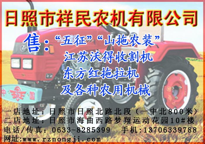 日照市祥民农机有限公司是一家私营企业,是柳林联合收割机、伟义花生脱壳机、树华粉碎机等日照地区总代理。并销售小型中型拖拉机及配件,以及各种农机具。 我公司始终坚持对用户高度负责,始终坚持质量+技术+服务=顾客的宗旨,配备一流的售后服务队伍,为您放心使用祥民农机做好后盾,本公司有各种型号农机,供您选用。拥有一台机器,占领一方市场,创造一片辉煌!