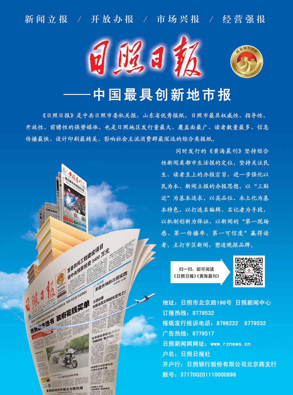 办公室:8779510 新闻采讨中心:8779523 摄影部: 8779528 日照新闻网:8779512 黄海晨刊新闻热线:8881111 财务结算中心:8779529 传媒文化公司:8779516 日照日报印务公司:2298989 日照报业发行公司:8779532 日照报春商贸公司:8779222 广告综合部:8779517 分类广告部:8776197 房产广告部:8779518 房产广告二部:8779569 汽车广告部:8802869 银企广告部:8779536 外联拓展广告部:8799333 医疗广告部:8010003 商业广告部:8779698 通讯广告部:8010006 餐饮婚庆广告部:8010001 旅游广告部:8010007 日照新闻网网址:www.rznews.cn