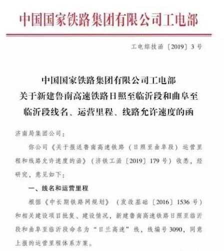 中国国家铁路集团有限公司工电部关于新建鲁南高速铁路日照至临沂段和曲阜至临沂段线名、运营里程、线路允许速度的函显示:根据《中长期铁路网规划》(发改基础 [2016] 1536号)和相关建设项目批复、建设情况,新建鲁南高速铁路日照至临沂段和曲阜至临沂段命名为“日兰高速”线,线编号3090,同意上报的运营里程体系方案。鲁南高速铁路是国家“八纵八横”铁路网的重要连接通道,线路全长494公里,设计时速350公里,东起山东省日照市,向西经临沂、曲阜、济宁、菏泽,在河南与郑徐高铁兰考南站接轨。是山东省有史以来建设里程最长、投资规模最大、建设条件最复杂、惠及人口最多的高速铁路。