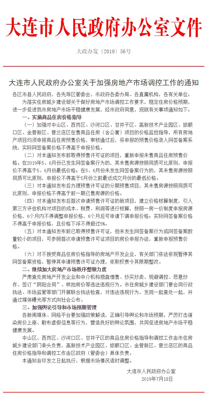 7月30日,大连市政府网站挂出《关于加强房地产市场调控工作的通知》称:要求实施商品住房价格指导,严肃查处房地产开发企业和中介机构捂盘惜售、炒买炒卖、规避调控、恶意炒作、签订“阴阳合同”、哄抬房价等违法违规行为。