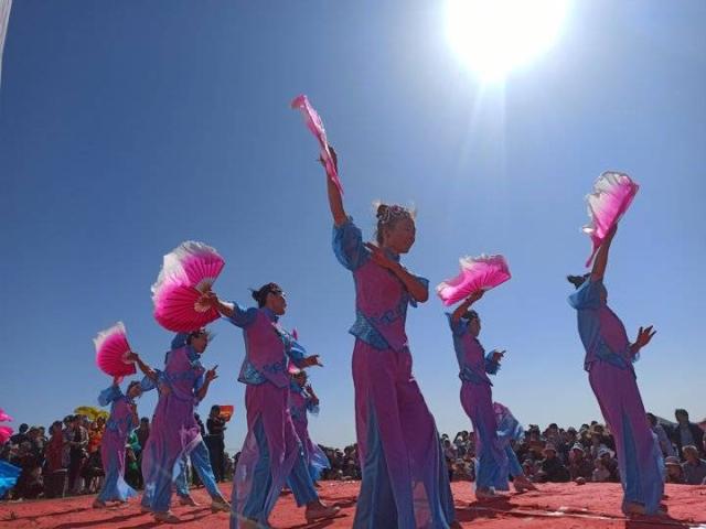 现场人们载歌载舞欢庆丰收,品尝甜美的丰收果实,同时来自日照市金海岸小学的小学生们体验田间劳作歌唱祖国。