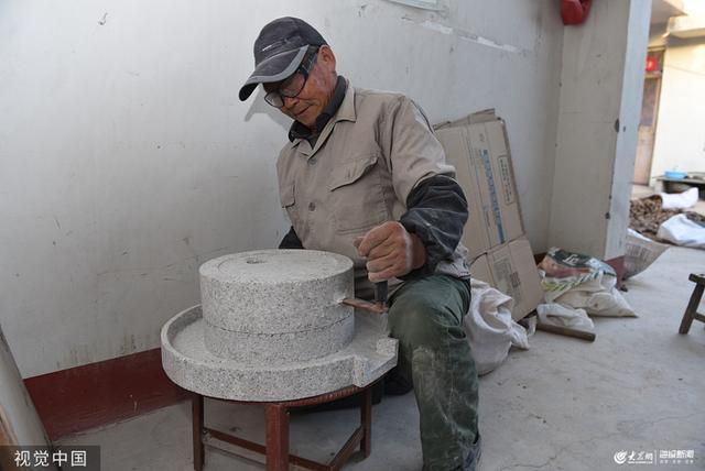 2019年10月29日,山东日照,在莒县寨里河镇大翟家沟村,今年67岁的老石匠翟玉乾正在家门口为客户赶制“微型石磨”。翟玉乾老人介绍,现在订单排了20多号了,完成这些订单得两个多月。