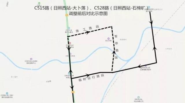 因岚山区巨峰镇相家楼村路段铺设排水管道,致使途经该路段的C515路(日照西站至大卜落)、C528路(日照西站至石棉矿)城乡公交无法正常通行。为满足乘客出行需求,经上级部门批准,公司决定自施工之日起对该线路进行临时调整,待施工完毕后恢复原线路运行。