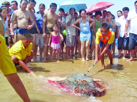8日上午,一名江苏的聋哑游客在日照海水浴场被蜇伤,“凶手”是直径1米的大型水母。