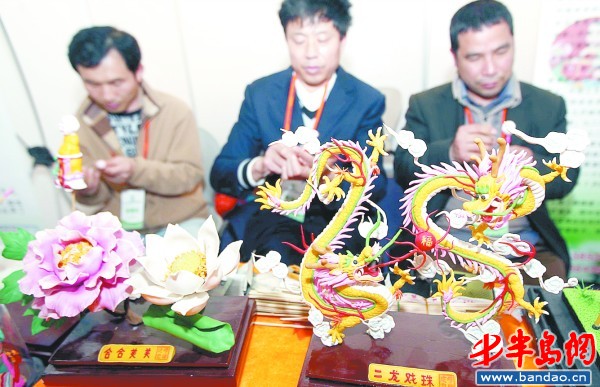 ▲菏泽面塑展台,精致的面塑艺术品卖得火。