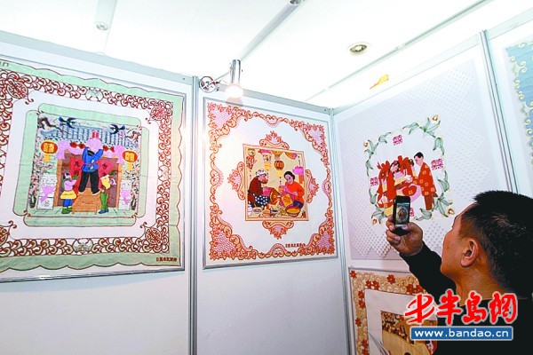 “日照农民画有着悠久的历史,是全国三大画乡之一。”在另外一个展台前,日照农民画介绍人赵家乐站在山东展区的几幅农民画前跟记者说,农民画就是立足于农民的生活。