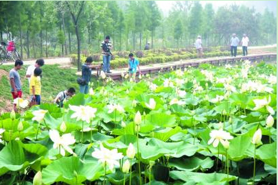 7月1日,市民游客在日照海滨国家森林公园的清风荷韵景区观赏盛开的荷花。