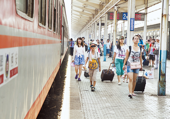 7月29日下午,乘坐西安至日照旅游列车的旅客走在站台上。