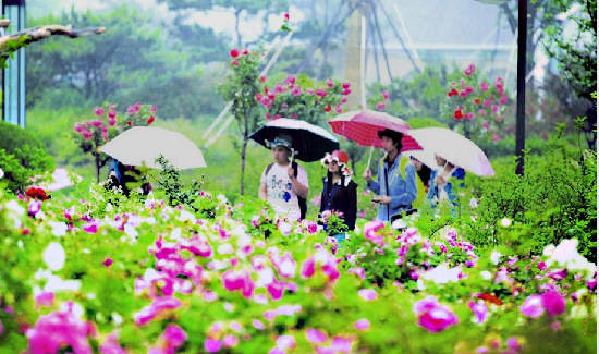 据介绍,玫瑰目前正值盛花期,以红色、紫色、白色、黄色为主打色系,花期可一直持续到6月下旬,欢迎市民们来植物园与玫瑰来一场“浪漫的约会”。图为几位市民正在欣赏怒放的玫瑰。(完)