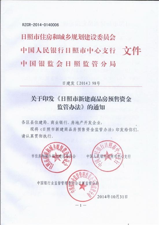 | 《日照市新建商品房预售资金监管办法》正式印发通知,请各区县住建局、商业银行,房地产开发企业认真贯彻执行。