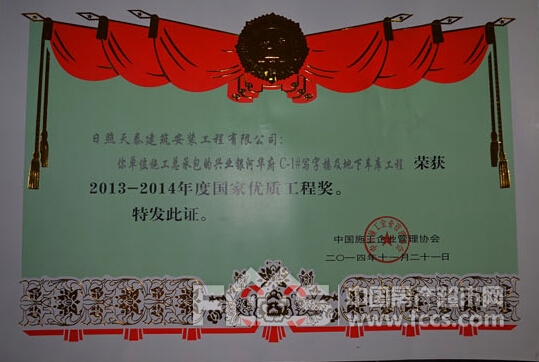 近日,在中施协下发的《关于表彰2013-2014年度国家优质工程奖的决定》中,日照市申报的日照天泰建筑安装工程公司施工的兴业银河华府c-1#写字楼及地下车库工程名列其中,这是日照市建筑本地企业首次获此殊荣。“国优工程”是我国工程建设领域的国家级质量奖,经国务院批准于1981年设立。
