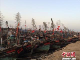 日照韩家营子渔民财神日当天在渔船上挂满寓意为“摇钱树”的竹竿。 郭亚楠 摄