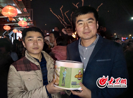 除了猜灯谜赢奖品,市民现场还可通过关注日照大众网官方微信和下载“日照24小时”新闻客户端参与现场抽奖。东港区的刘先生通过抽奖,第一个获得一盒价值48元的粮全其美手抓饼奖品,笑得合不拢嘴。