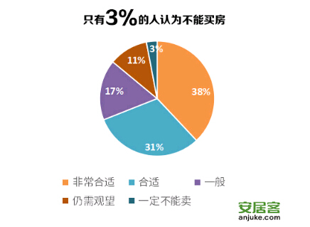 另据安居客房产指数报告,近七成人认为现在购房时间适合,另有11%的人表示要观望,仅有3%的人群认为一定不能买房。