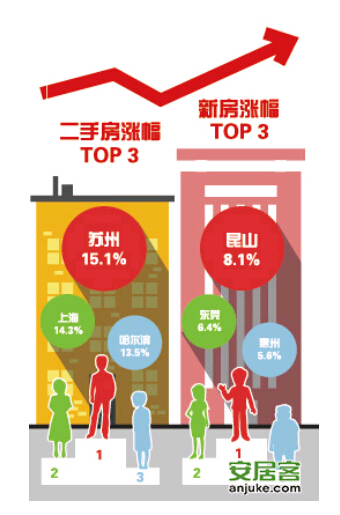 安居客房产指数报告显示,今年3月,新房价格涨幅最高的是县级市昆山,环比涨幅达8.1%,东莞、惠州以6.4%、5.6%的涨幅位居二三位。二手房涨幅上,苏州以涨幅15.1%位居第一,上海以涨幅14.3%位列第二,哈尔滨以涨幅13.5%位居第三。