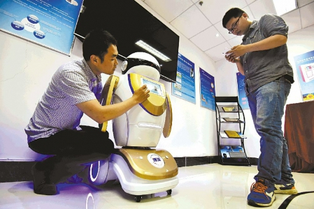 6月14日,日照经济技术开发区科技孵化中心创泽信息的技术人员正在调试智能机器人“创创”。