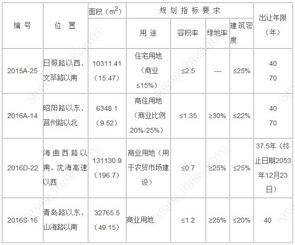 2016S-16,位于青岛路以东、山海路以南,面积32765.5平米,用途为商业用地,容积率≤1.2,绿地率≥25%,建筑密度≤20%,出让年限40年,起叫价7400万,加价幅度100万。