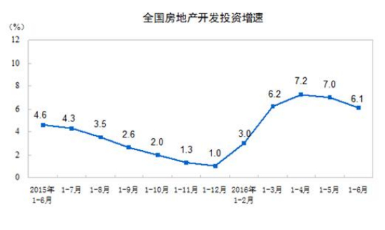 具体而言,全国房地产开发投资增速从今年(2016)1月份以来连续增长,到4月份共增长了7.2%,之后进入了增速减慢的“拐点”——1-5月增长7.0%,增速回落0.2个百分点,到6月份则回落0.9%。