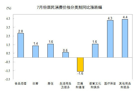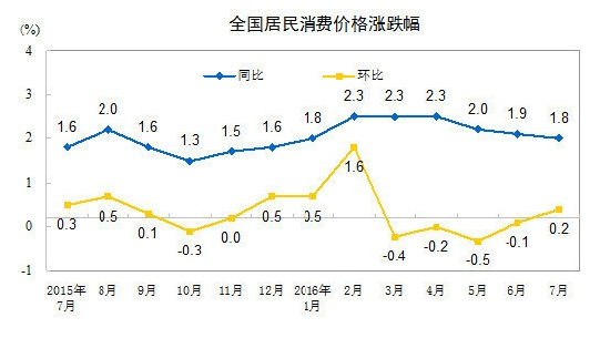 2016年7月份,全国居民消费价格总水平同比上涨1.8%。其中,城市上涨1.8%,农村上涨1.5%;食品价格上涨3.3%,非食品价格上涨1.4%;消费品价格上涨1.4%,服务价格上涨2.3%。