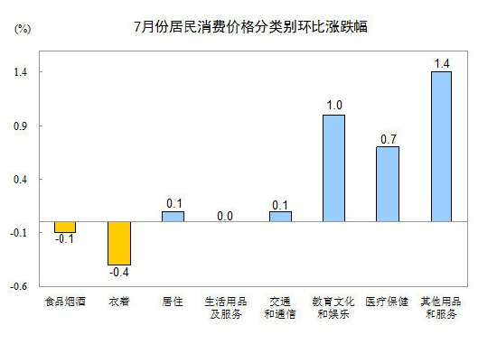 7月份,全国居民消费价格总水平环比上涨0.2%。其中,城市上涨0.3%,农村持平;食品价格下降0.2%,非食品价格上涨0.3%;消费品价格下降0.1%,服务价格上涨0.6%。