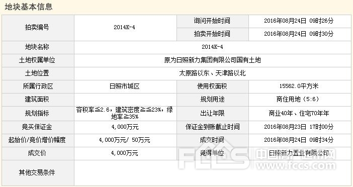 2014K-4地块位于太原路以东、天津路以北,面积15562.0平米(23.34亩),用途为商住用地(5:6),容积率≤2.6,绿地率≥35%,建筑密度≤23%,出让年限住宅部分70年,商业部分40年,起叫价4000万,成交价4000万。