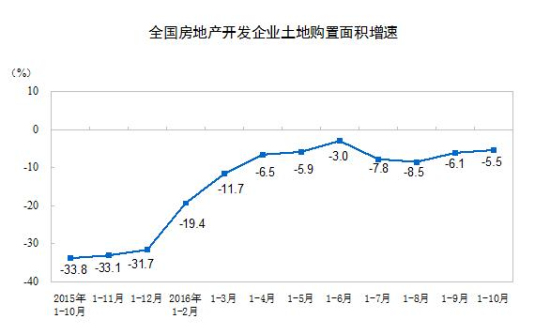 1-10月份,房地产开发企业土地购置面积16873万平方米,同比下降5.5%,降幅比1-9月份收窄0.6个百分点;土地成交价款6764亿元,增长16.7%,增速提高3.4个百分点。