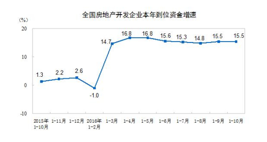1-10月份,房地产开发企业到位资金117261亿元,同比增长15.5%,增速与1-9月份持平。其中,国内贷款17303亿元,增长1.2%;利用外资123亿元,下降49.0%;自筹资金40764亿元,增长0.6%;其他资金59071亿元,增长35.2%。在其他资金中,定金及预收款33655亿元,增长32.2%;个人按揭贷款19783亿元,增长51.5%。