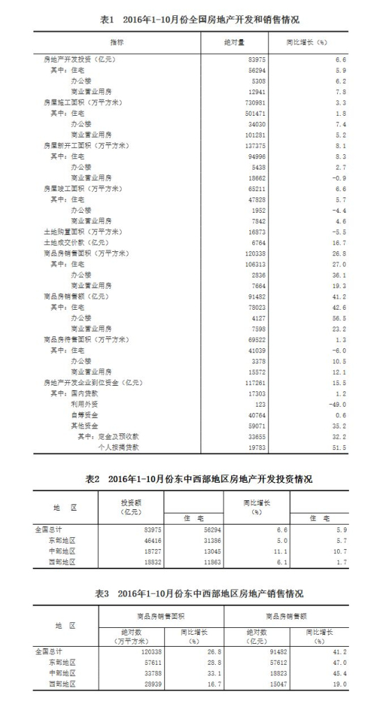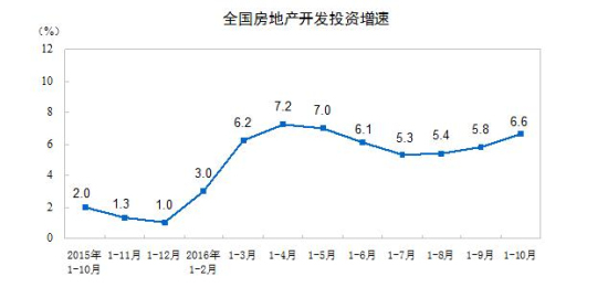 2016年1-10月份,全国房地产开发投资83975亿元,同比名义增长6.6%,增速比1-9月份提高0.8个百分点。其中,住宅投资56294亿元,增长5.9%,增速提高0.8个百分点。住宅投资占房地产开发投资的比重为67.0%。