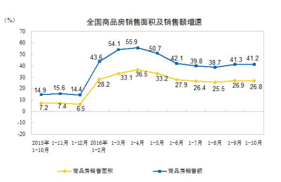 1-10月份,商品房销售面积120338万平方米,同比增长26.8%,增速比1-9月份回落0.1个百分点。其中,住宅销售面积增长27.0%,办公楼销售面积增长36.1%,商业营业用房销售面积增长19.3%。商品房销售额91482亿元,增长41.2%,增速回落0.1个百分点。其中,住宅销售额增长42.6%,办公楼销售额增长56.5%,商业营业用房销售额增长23.2%。
