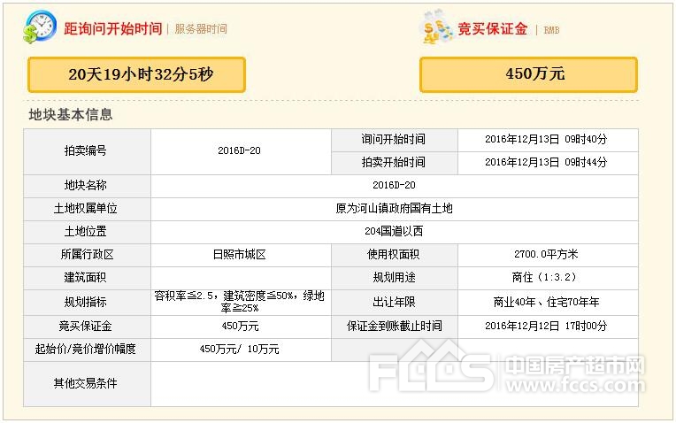 2016D-20号地块位于204国道以西,面积2700平米(4.05亩),用途为商住用地(1:3.2),容积率≤2.5,绿地率≥25%,建筑密度≤50%,土地出让年限商业40年,住宅70年。