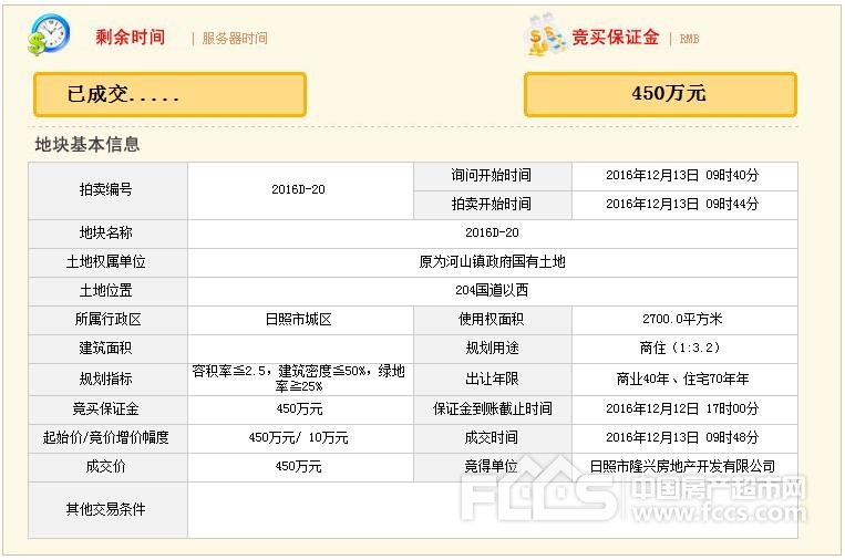 2016D-20号地块位于204国道以西,面积2700平米(4.05亩),用途为商住用地(1:3.2),容积率≤2.5,绿地率≥25%,建筑密度≤50%,土地出让年限商业40年,住宅70年,由日照市隆兴房地产开发有限公司以450万底价竞得。