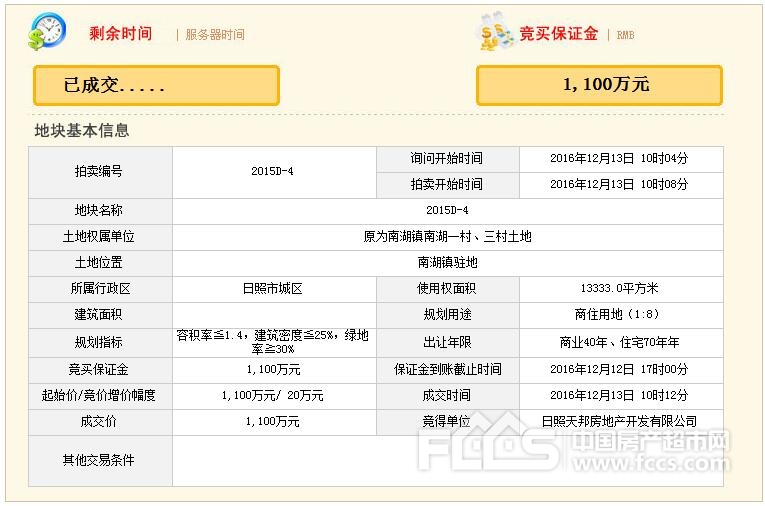 2015D-4号地块位于南湖镇驻地,面积13333平米(20.0亩),用途为商住用地,容积率≤1.4,绿地率≥30%,建筑密度≤25%,土地出让年限商业40年,住宅70年。该地块由日照天邦房地产开发有限公司竞得,成交价1100万,同样为底价成交。