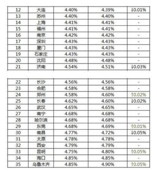 具体来看,在融360监测的全国35个主要城市中,利率环比下降的为4城,环比上月增加2城;保持不变的仍为26城,利率环比上升的5城,这其中,平均利率最低的为天津的4.13% ,最高为乌鲁木齐的 4.9%,乌鲁木齐的首套房贷利率在上月经历过2016年首次降低之后,在本月重新拉回到了基准利率。