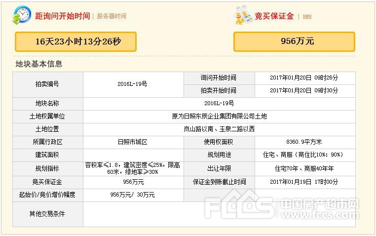 据日照市国土资源网上交易平台显示,日照市区将于1月20日拍卖一宗商住用地,该地块位于岚山区,起叫价956万。