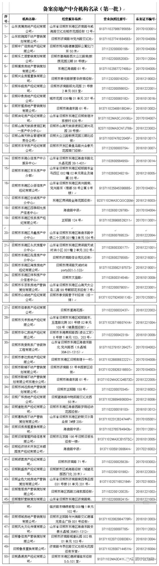 据介绍,根据国家住房城乡建设部、省住房城乡建设厅有关文件精神,日照市住建局对市区房地产经纪机构开展了专项整治行动。依据国家住房城乡建设部等3部门《房地产经纪管理办法》、《日照市房地产经纪机构备案管理暂行办法》等有关规定,决定将已在日照市住建局备案的、50家房地产经纪机构(分支机构)相关信息公示。据悉,公示的50家单位均于2017年2月17日前在日照市住建局进行了备案。同时,相关信息也在日照市住建局政务网站同步公示(网站为http://www.rzfgj.gov.cn)。