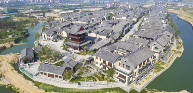 俯瞰山东省日照市东夷小镇一期建设全貌(7月11日摄)。