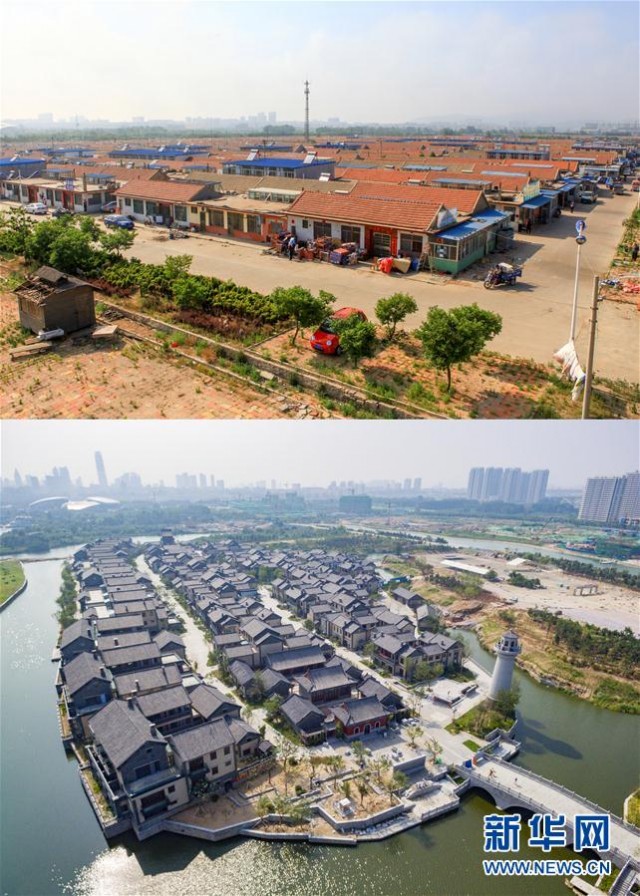 上图为秦楼街道董家滩村一角(2012年6月4日摄);下图为俯瞰日照市东夷小镇一期建设全貌(7月11日摄)。