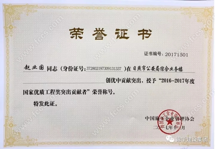 12月13日,国家优质工程奖总结表彰大会在人民大会堂召开,锦华集团承建的日照市公安局综合业务楼工程被授予“国家优质工程”奖,锦华安装公司作为空调安装单位被授予“国家优质工程”参建单位奖,赵业国、袁志明获“国家优质工程奖突出贡献者”荣誉称号。